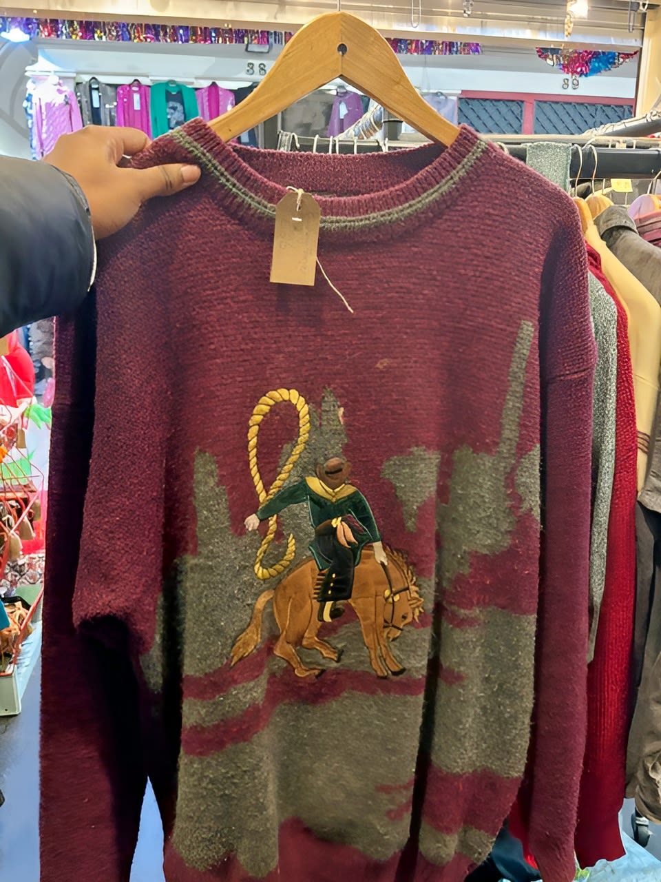 This sweater with a cowboy design from the Yesterday Society Vintage is believed to be from the '70s-'80s.