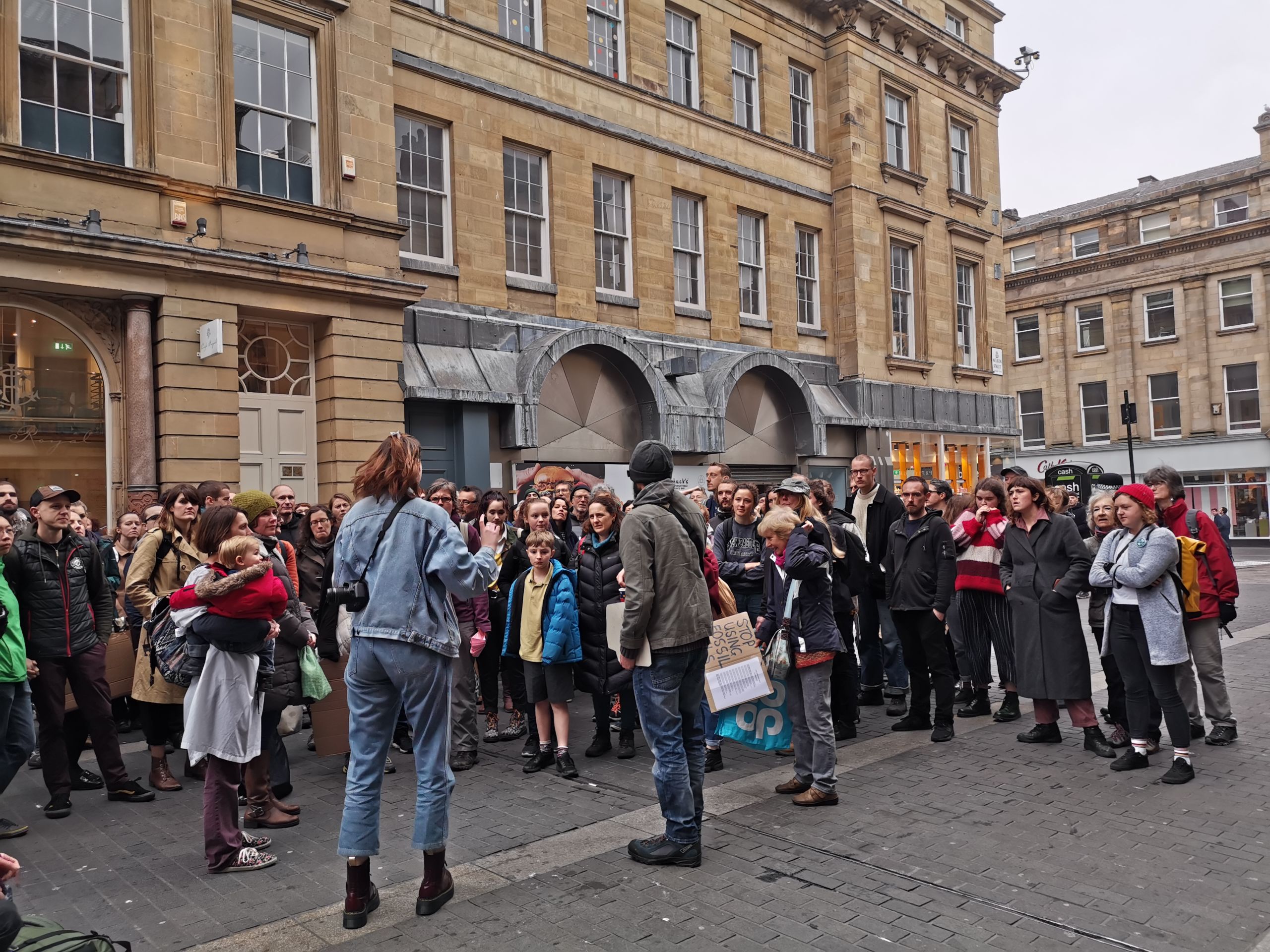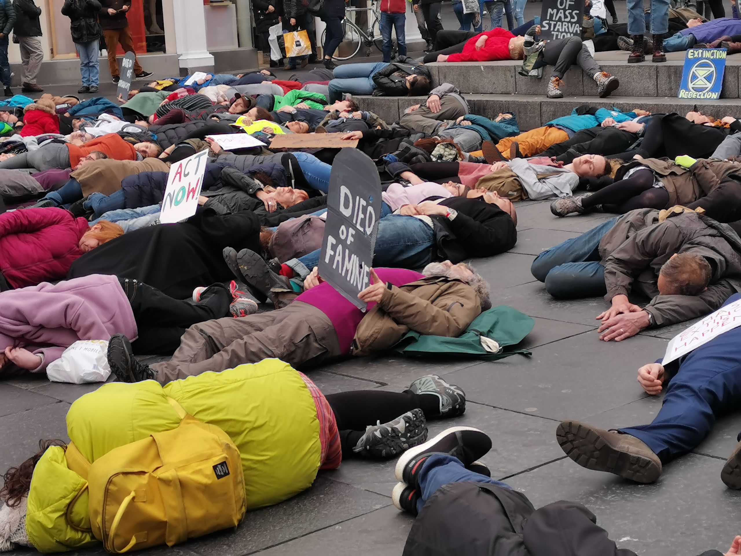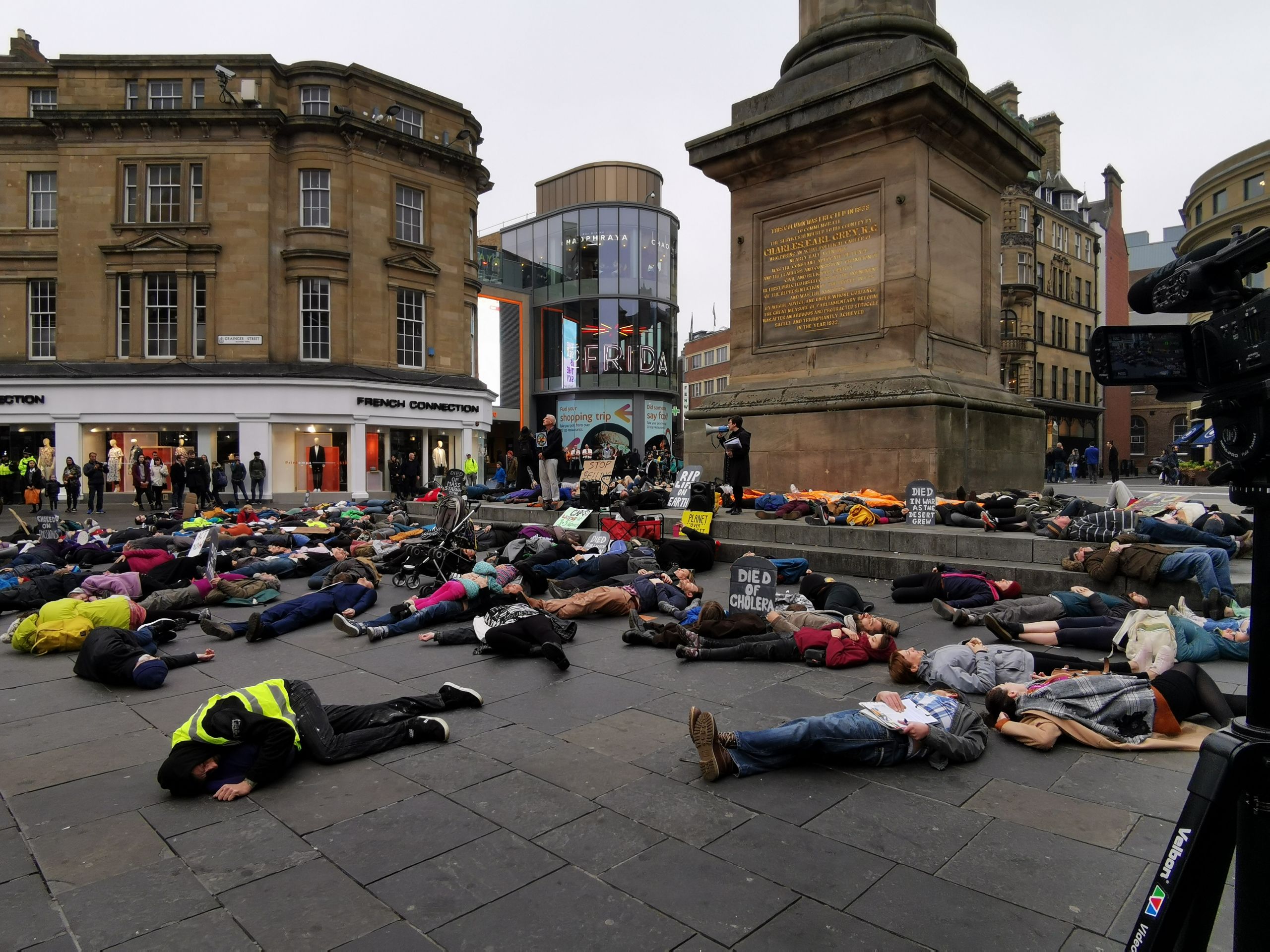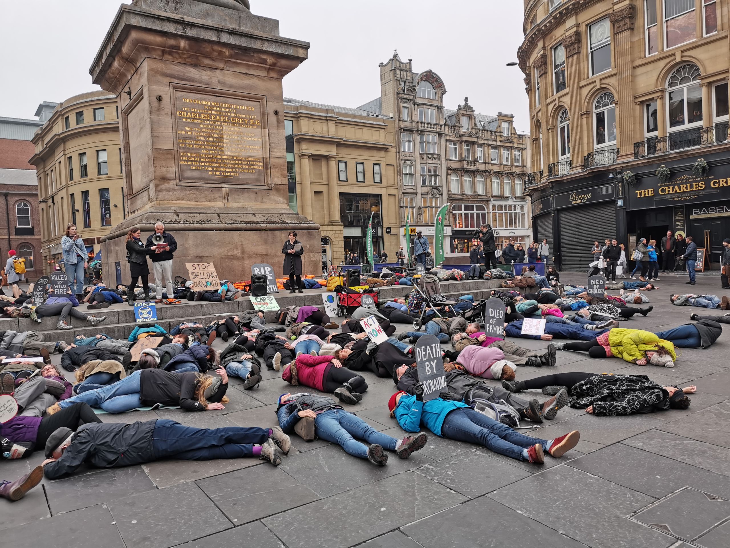 Previously in the week protesters had held a die-in at Newcastle Monument. Groups of people fell to the floor when their 'cause of death was read out. The causes of death were displayed on cardboard gravestones and included: Cholera, Drought, Famine, War, Drowning and Starvation among other grisly endings. These are projections of what most of the population will end up dying of, if we don't act now to prevent a climate breakdown.