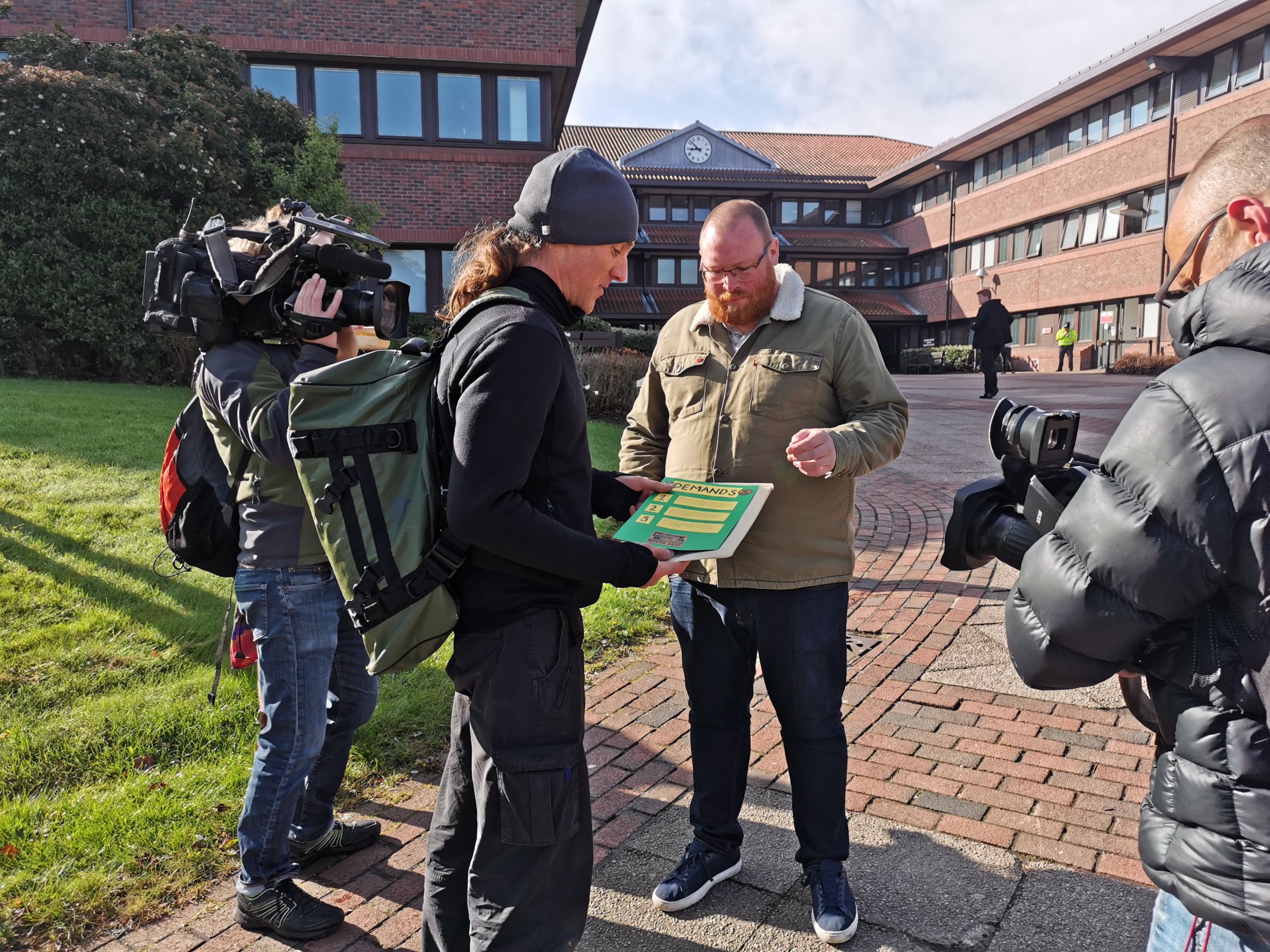 XRNE Representative (L) hands the list of demands over to Low Fell Labour candidate Calvin Lawson (R)