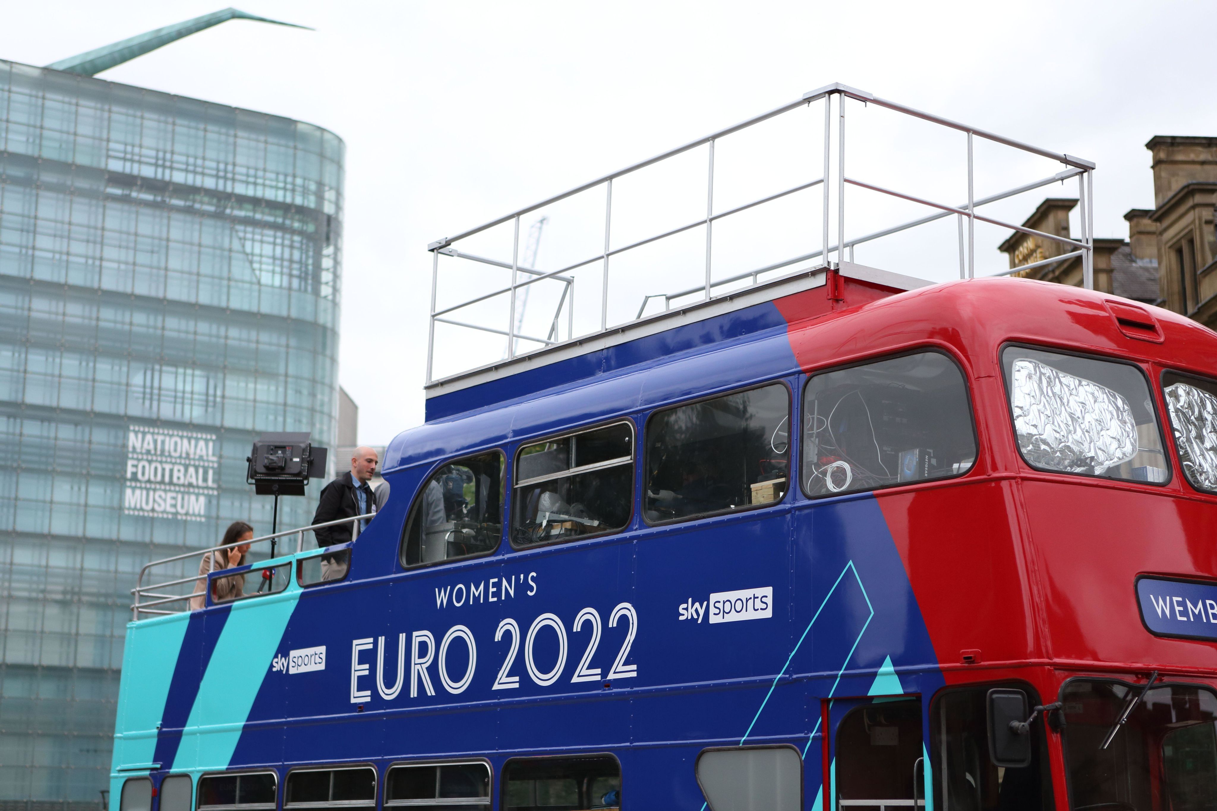 Sky Sports bus outside The National Football Museum on day of England v Austria UEFA Womens Euro 6 July 2022 Old Trafford Manchester