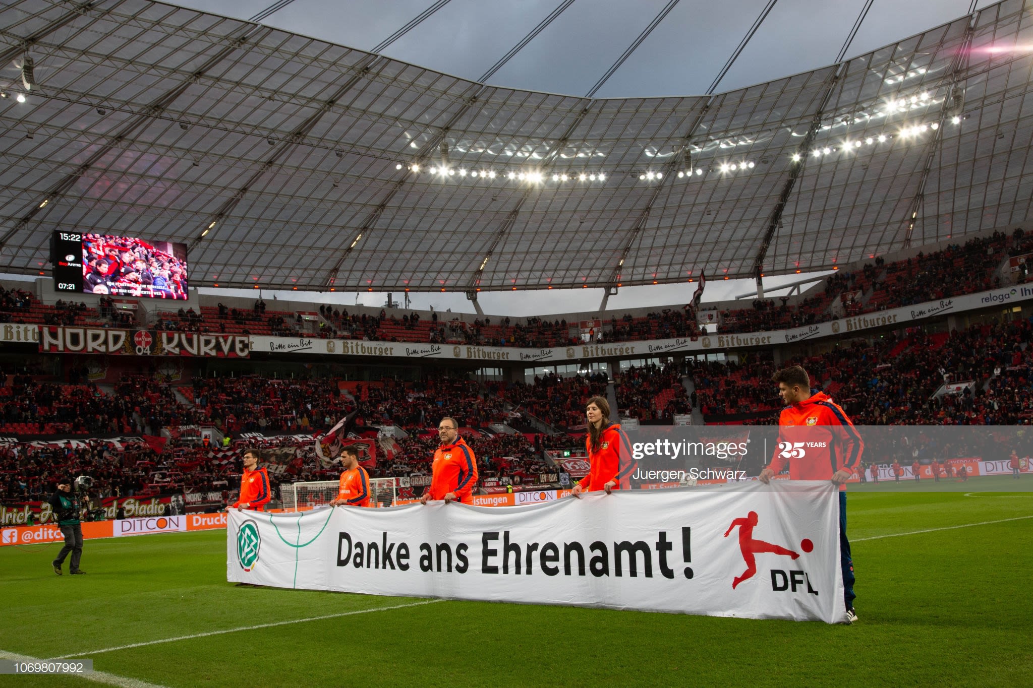 Title Picture - LEVERKUSEN, GERMANY - DECEMBER 08: Banners displayed on the pitch read "thank you for volunteering" during the Bundesliga match between Bayer 04 Leverkusen and FC Augsburg at BayArena on December 8, 2018 in Leverkusen, Germany (Juergen Schwarz/Bongarts/Getty Images)